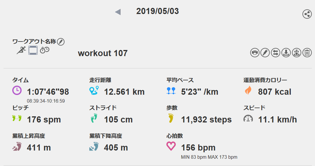 5月3日の走行距離 12.56km (5分23秒/km)(156bpm)