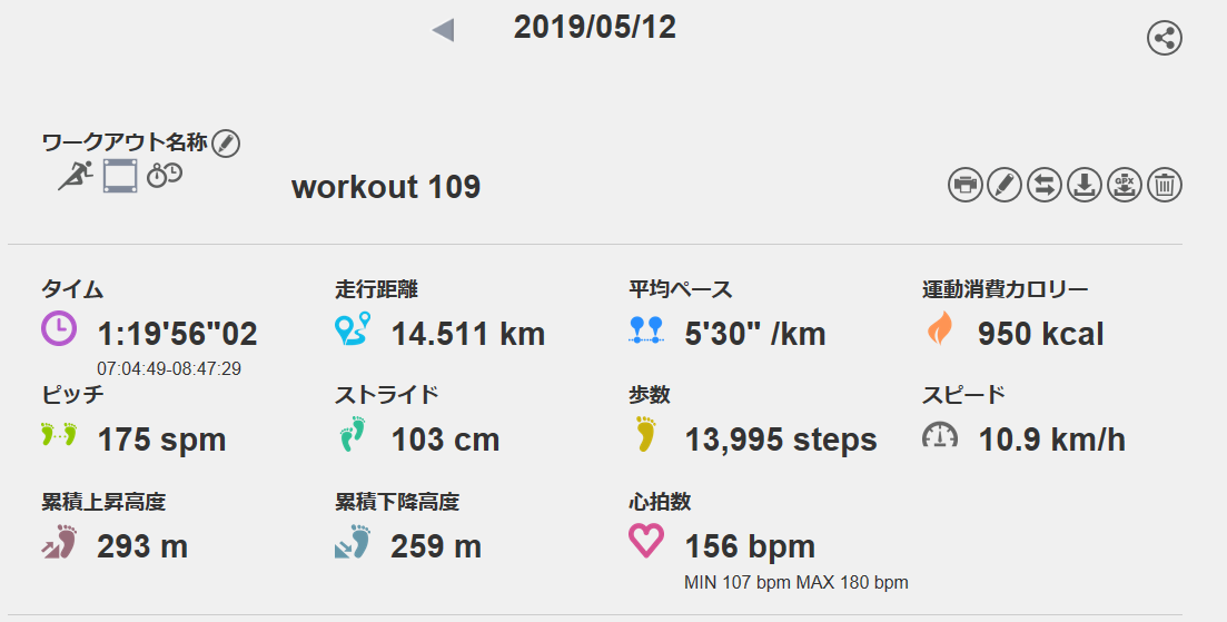 5月12日の走行距離 14.51km (5分30秒/km)(156bpm)