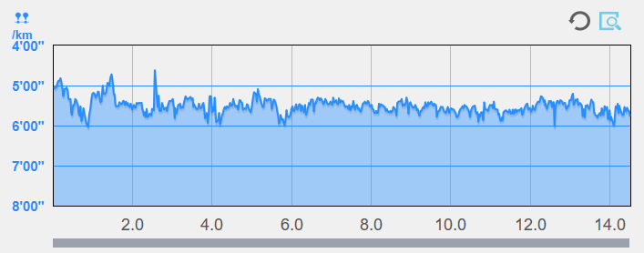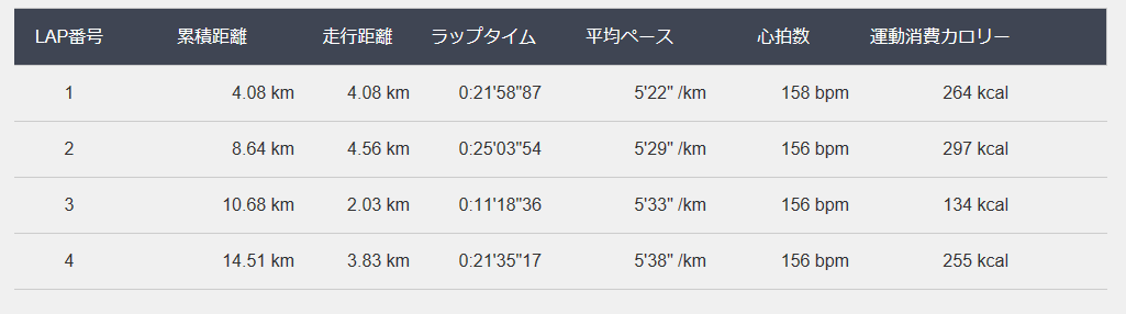 ゴールデンウィークの走り込みのおかげか、14キロを平均5:30/hで走れていたので、良かった。