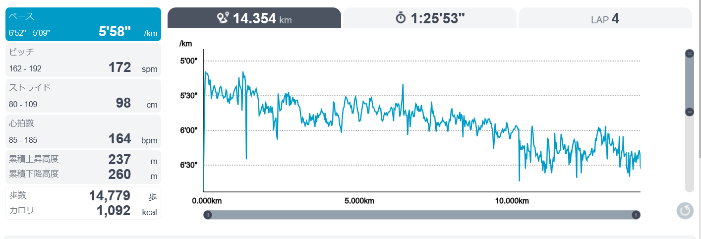 暑さはそうでもなくて走りやすいと思ったけど、終盤はペースが落ちた。
