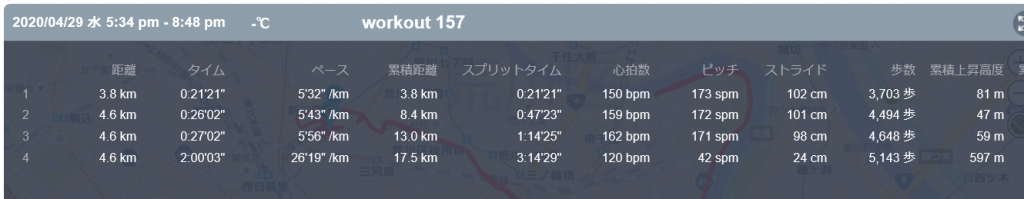 4月29日の走行距離 17.51km (-分–秒/km)(—bpm)