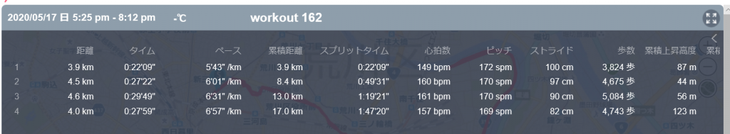 5月17日の走行距離 17.01km (6分18秒/km)(157bpm)