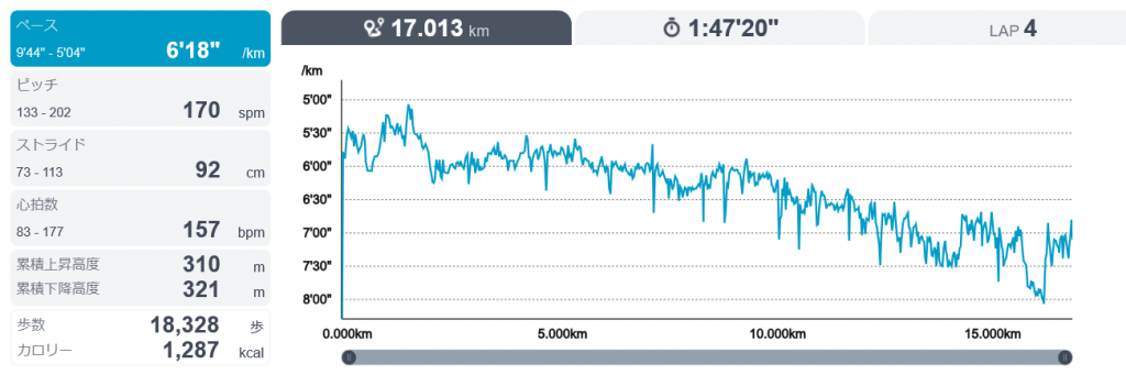 一昨日走った時は17キロは無理だったと思ったので、早めに切り上げた。