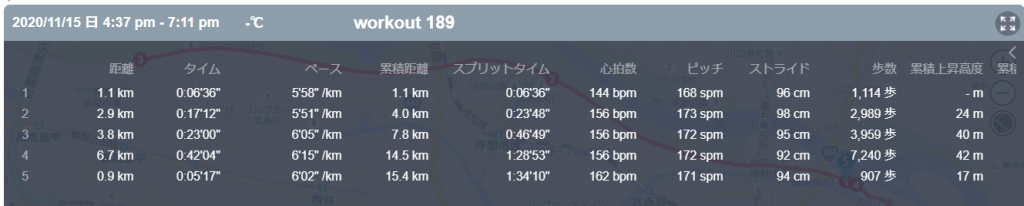 11月15日の走行距離 15.40km (6分06秒/km)(155bpm)