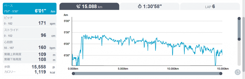 前回は距離を短めに変更したうえに歩いてしまったけど、今日はなんとか15キロ走り切れた。