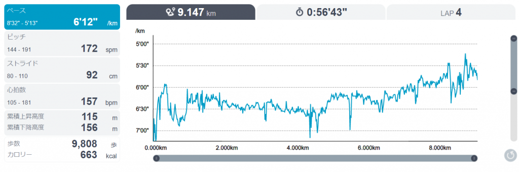 折り返し地点で心拍数も160程度でまだ余力がありそうだったので、後半はペースを上げてみた。