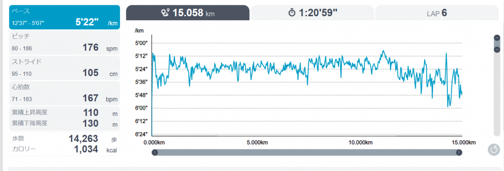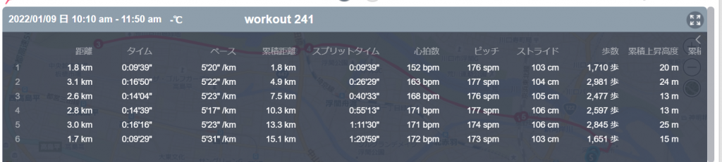 1月9日の走行距離 15.05km (5分22秒/km)(167bpm)
