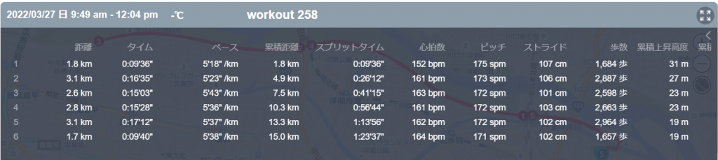 3月27日の走行距離 15.04km (5分33秒/km)(161bpm)