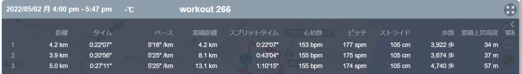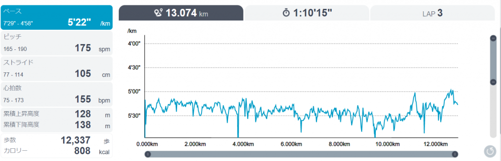 心拍数が155bpmで5分22秒/kmで走れたことにはちょっと驚き。