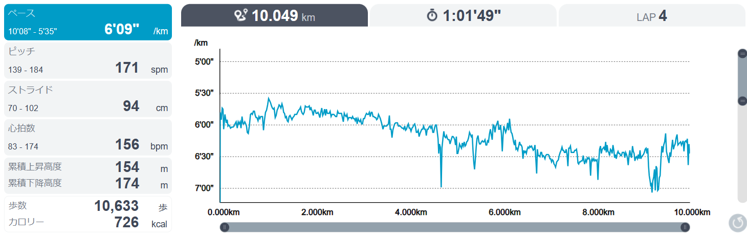 5,6キロは走り続けていたけど、10キロになると後半バテた。