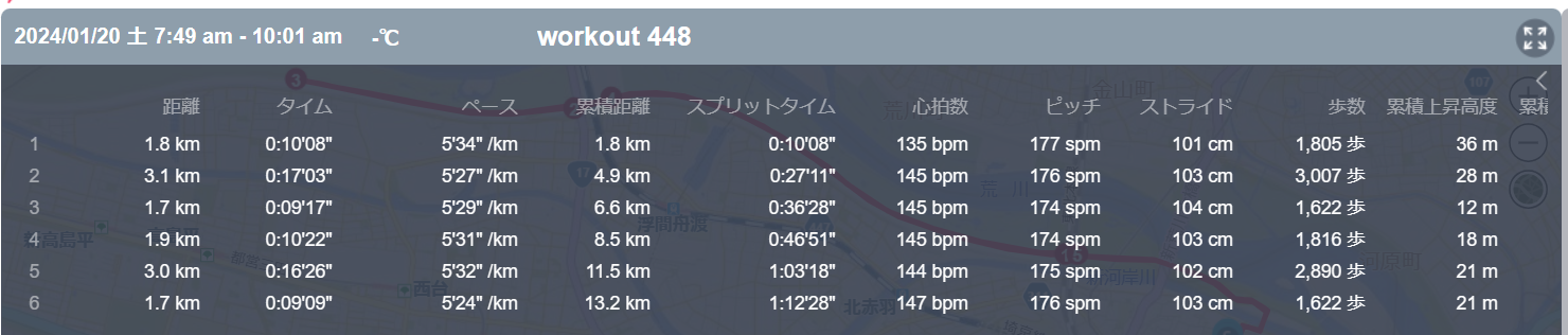 1月20日の走行距離 13.16km (5分30秒/km)(143bpm)