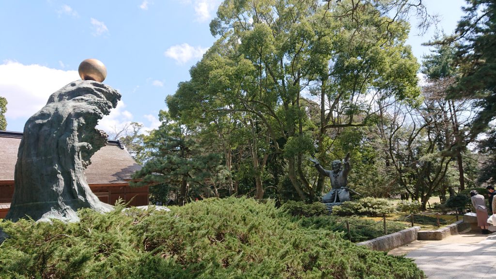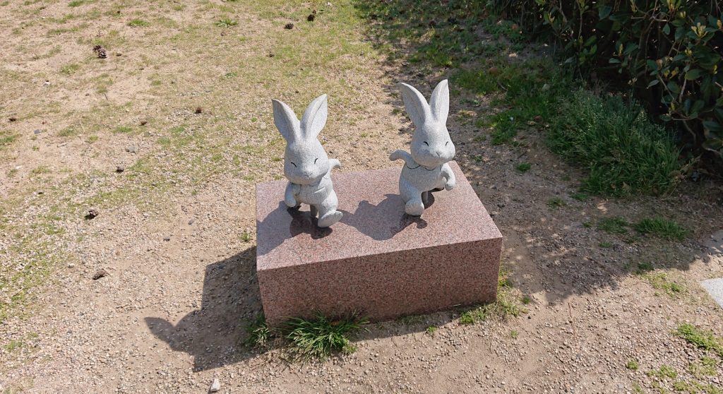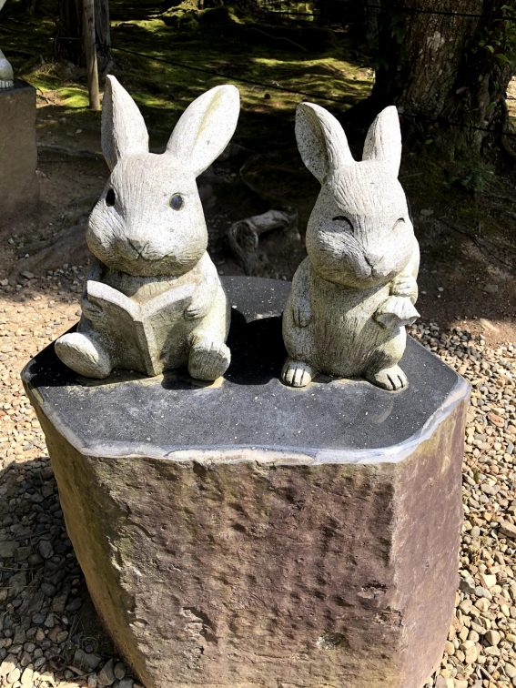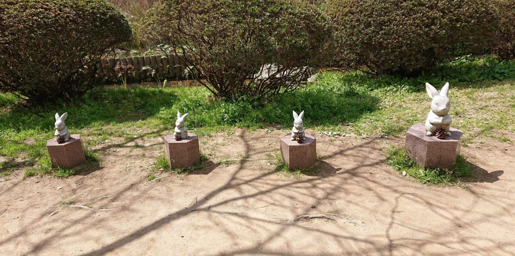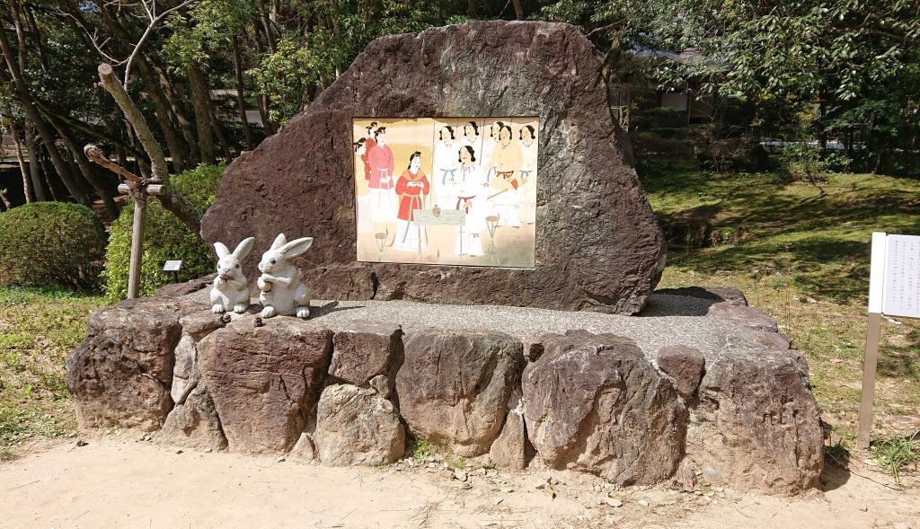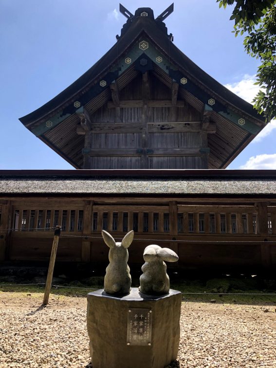 境内には 神話「因幡の白兎」を基に作られたウサギの像がたくさんある。