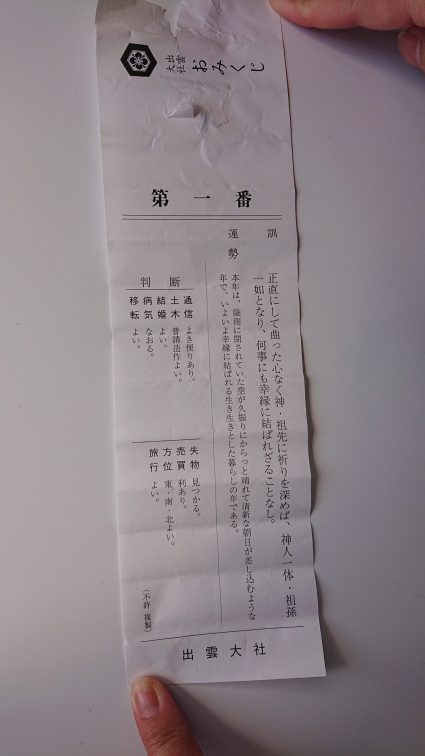 おみくじを引いたところ、結婚よい、移転よいだった。