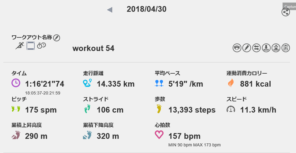 4月30日の走行距離 14.33km (5分19秒/km)(157bpm)