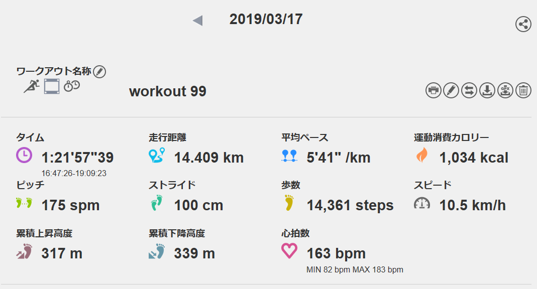3月17日の走行距離 14.40km (5分41秒/km)(163bpm)