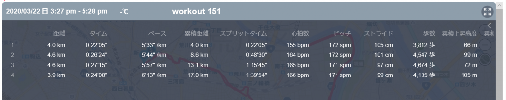 3月22日の走行距離 17.02km (5分52秒/km)(163bpm)