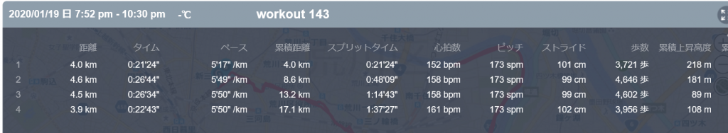 1月19日の走行距離 17.08km (5分42秒/km)(158bpm)