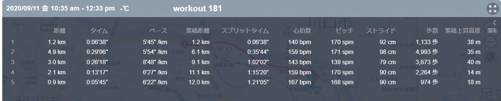 9月11日の走行距離 12.02km (6分44秒/km)(153bpm)