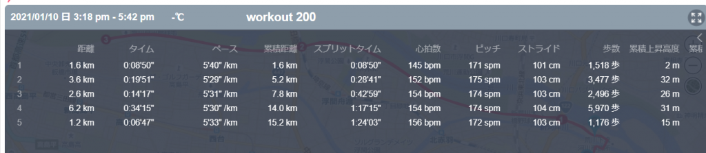 1月10日の走行距離 15.19km (5分36秒/km)(151bpm)