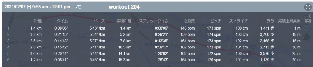 2月7日の走行距離 15.29km (5分40秒/km)(160bpm)