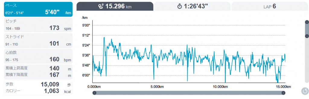それでもトータルで見ると、5分40秒/kmだったので、そこまで悪くはなかった。