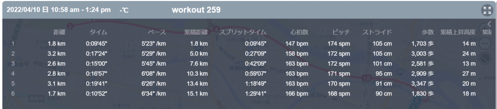 4月10日の走行距離 15.05km (5分57秒/km)(161bpm)