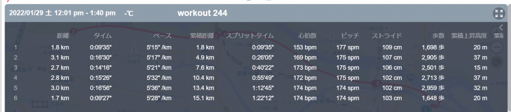 1月29日の走行距離 15.13km (5分25秒/km)(170bpm)