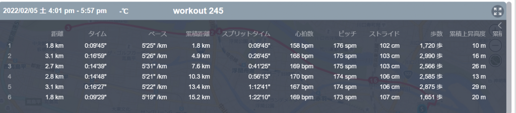 2月5日の走行距離 15.16km (5分25秒/km)(167bpm)