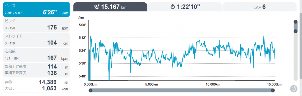 トータルで見ると、前回と同じペースで5分25秒/kmだった。