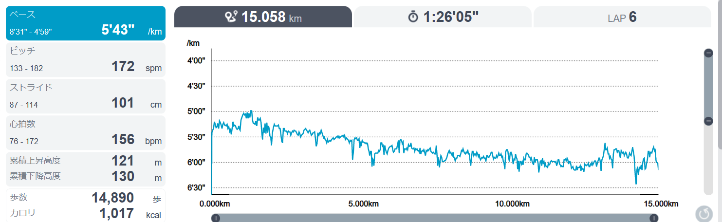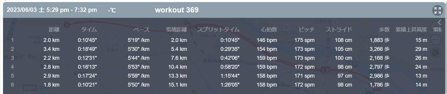 6月3日の走行距離 15.05km (5分43秒/km)(156bpm)