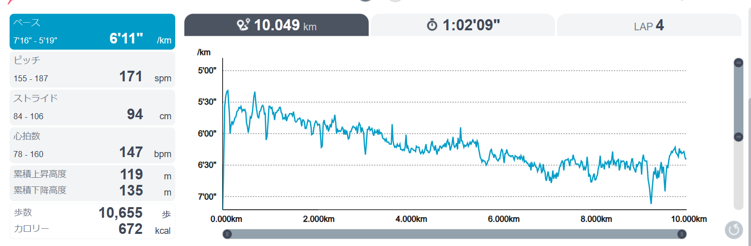 12キロ走ろうかとも思ったけど、5キロで折り返して10キロ止まり。