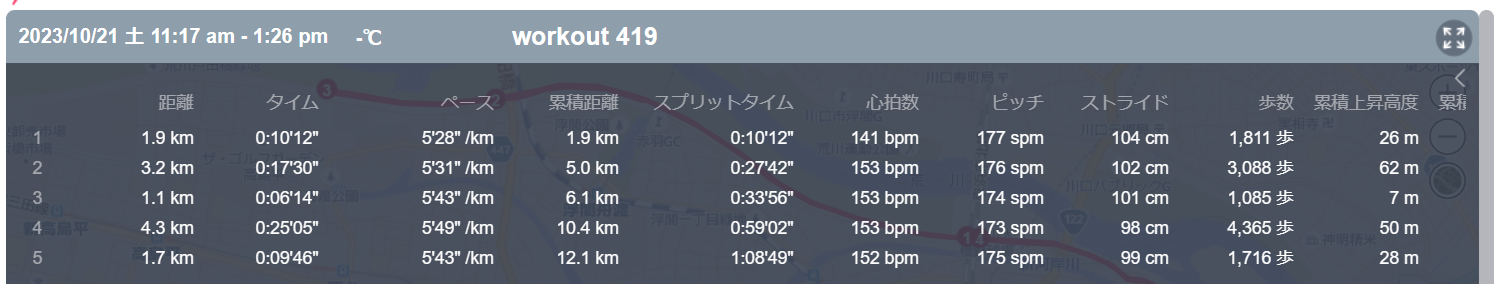 10月21日の走行距離 12.13km (5分40秒/km)(151bpm)
