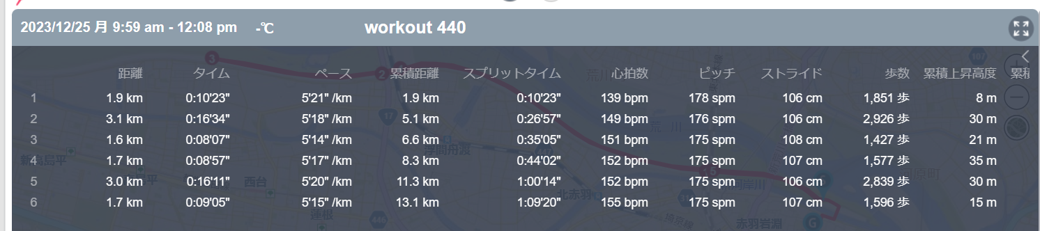12月25日の走行距離 13.06km (5分18秒/km)(150bpm)