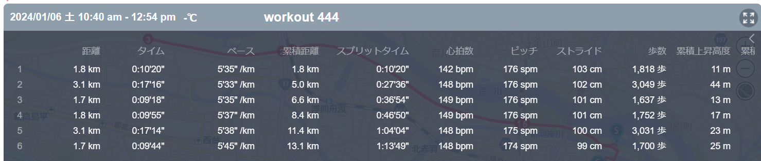1月6日の走行距離 13.12km (5分37秒/km)(147bpm)