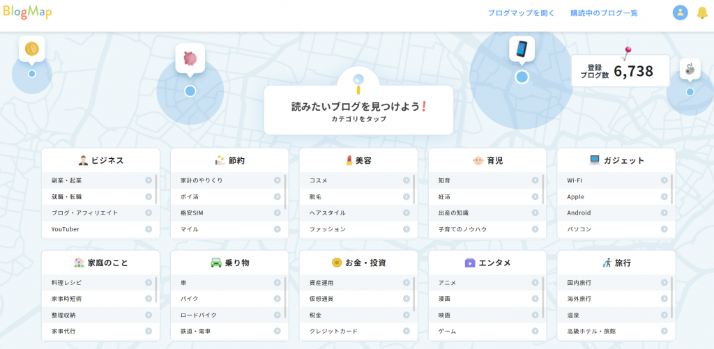 BlogMapではジャンルごとに、購読者数順、いいね数順、新着順というランキングでブログを紹介してくれる。