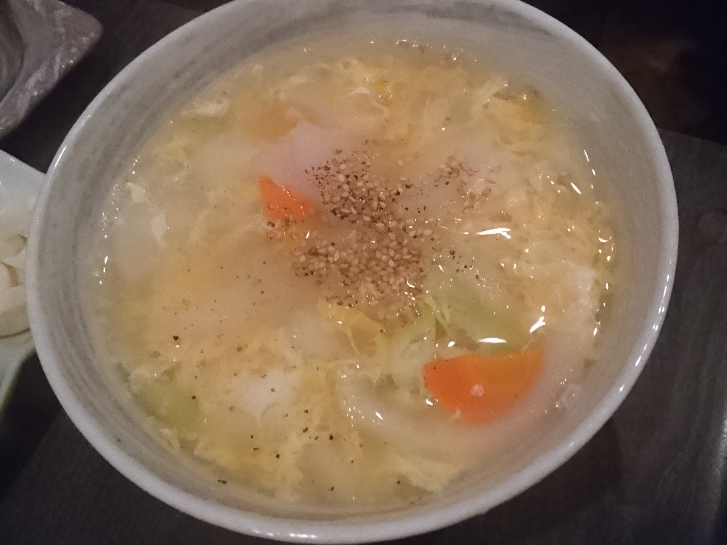 スープを飲んでみたら、あっさりした鶏ガラスープで結構おいしかった。