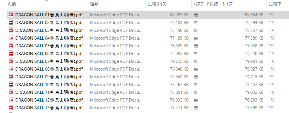 ダウンロードして解凍すると、こんな感じに漫画のタイトルと巻数がついたPDFファイルになっていた。