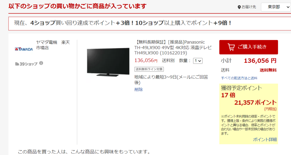 楽天スーパーセールで購入したので、134,800円に対してポイントが21,357ポイント付いた。