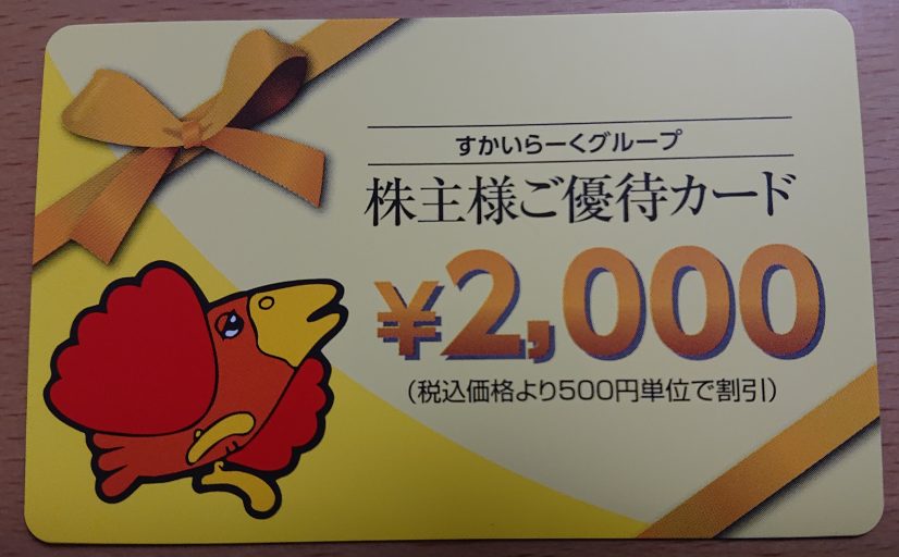 投稿日: 2022年3月14日 投稿者: wpmasterすかいらーくホールディングスの株主優待が届いた(2022年3月) 2022年3月14日(月) 今日、ポストにすかいらーくホールディングスの株主優待が届いていた。 100株の優待はすかいらーくグループで使える2,000円の優待カード。 有効期限は2023年3月31日。 まだ半年前にもらった優待券も使いきれていない。 含み損が約2万円あるし、優待も気に入っているので、このまま長期保有予定。 2020年6月から保有しているからすでに2年弱保有中。
