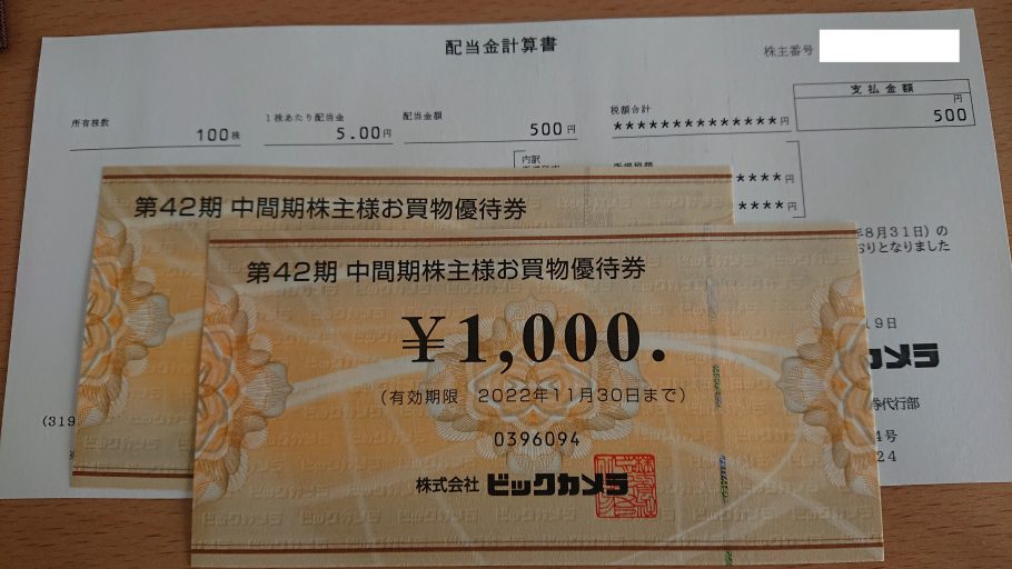 投稿日: 2022年5月21日2022年5月21日 投稿者: wpmasterビックカメラの株主優待が届いた(2022年5月) 2022年5月21日(金) ポストにビックカメラの優待が届いていた。 100株の優待はビックカメラ、コジマ、ソフマップなどで使える優待券1000円分が2枚。加えてポイント付与が10%から13%になるクーポン券。 有効期限は来年の11月30日。 配当金も100株で500円を得た。(税引き後は399円) 現在の株価は1100円。 配当利回りは1.36%。 現在、9000円ぐらいの含み益。 含み益が20000円ぐらいになったら、手放すかもしれない。