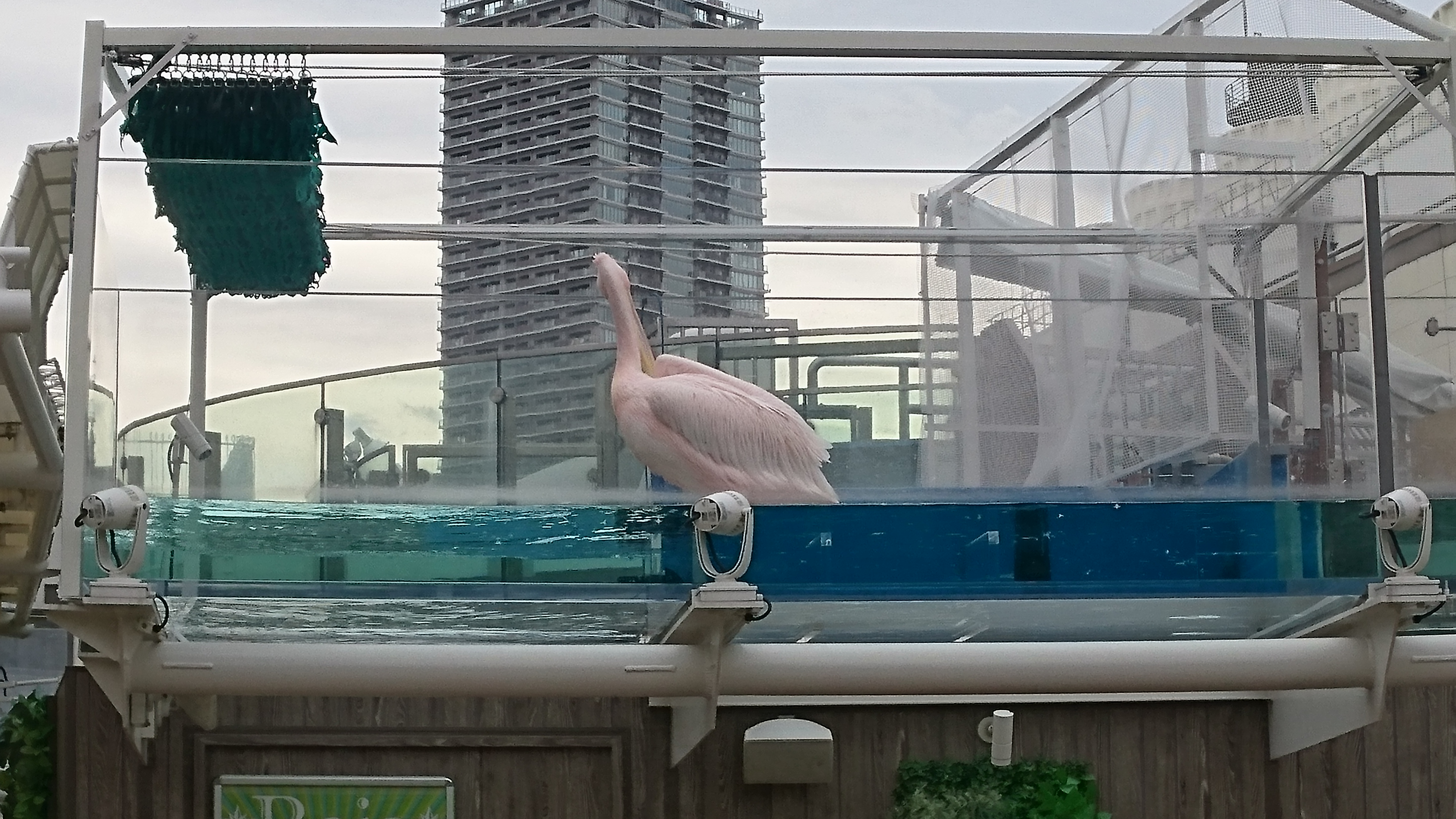 この鳥は変わった高さ(頭上)の水槽にいる。