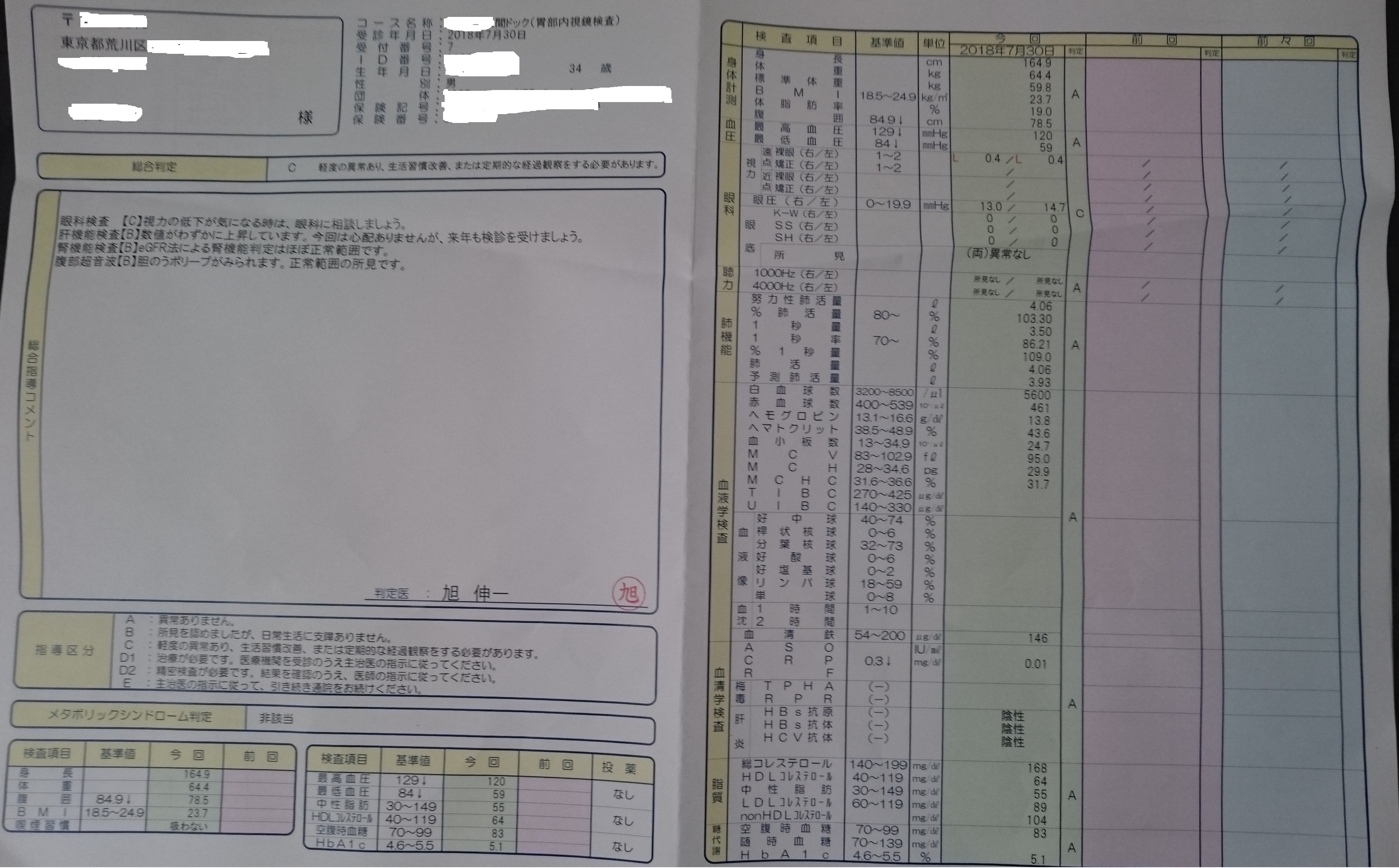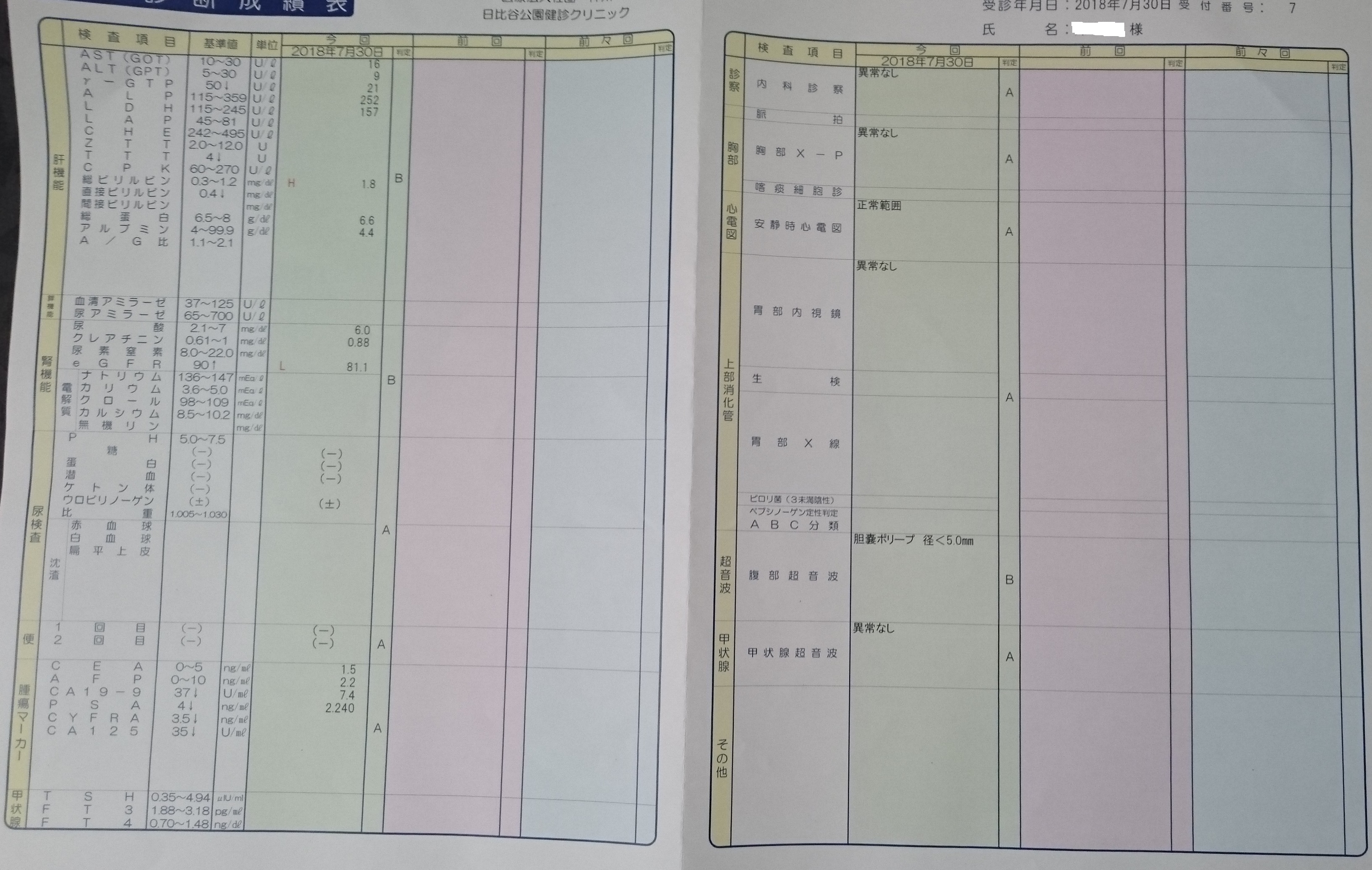 2018年7月30日に受信した人間ドックの結果が戻ってきた。